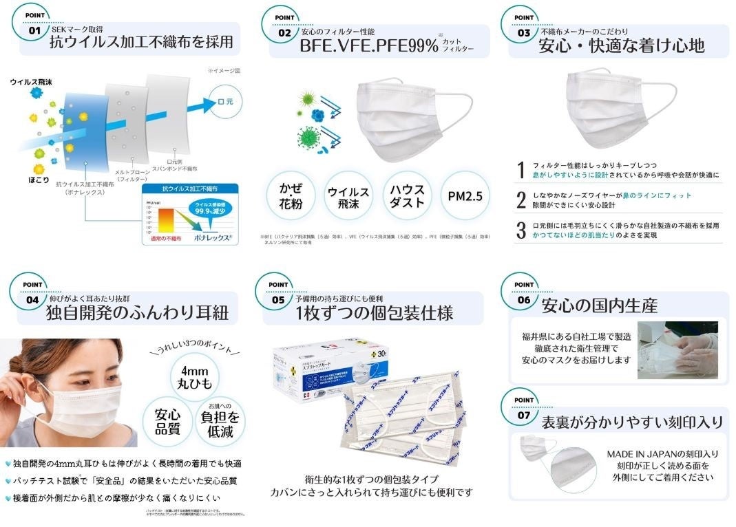・BFE(バクテリア飛沫捕集(ろ過)効率)、VFE(ウイルス飛沫捕集(ろ過)効率)、PFE(微粒子捕集(ろ過)効率) 99%カットフィルターを採用