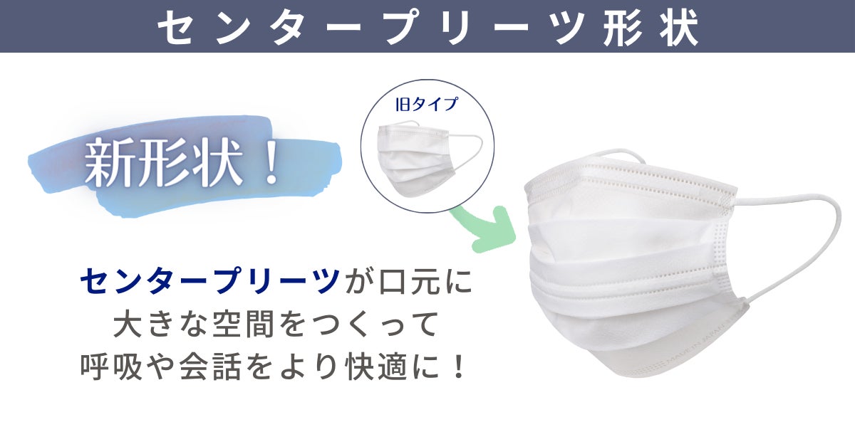 従来のプリーツを下に広げる三段プリーツ形状から、暑い夏にも快適にマスクを着用いただけるよう、センタープリーツ形状に変更いたしました。
