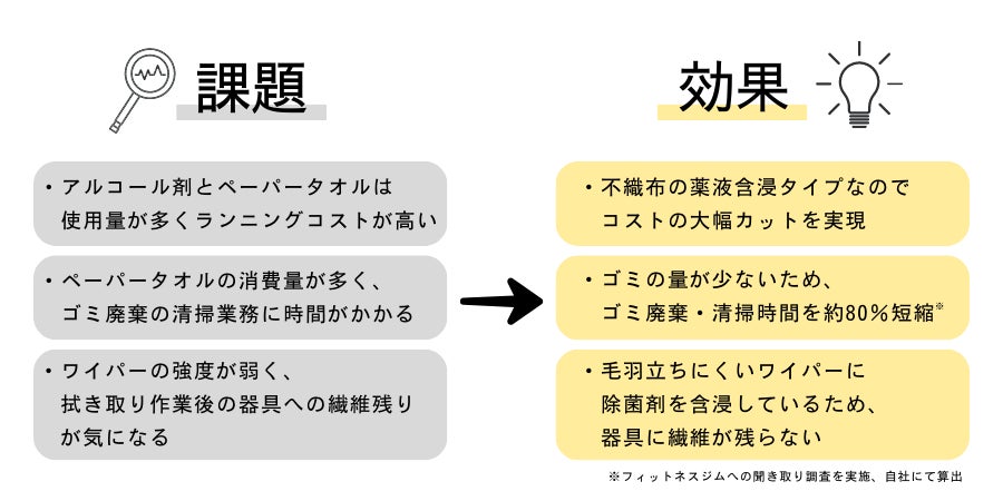 新型コロナウイルスの感染拡大以降、フィットネスジムでは運動器具使用後に、アルコール剤等を使用した除菌・消毒作業が求められるようになり、時間やコスト(人、モノ)の負担が増加しました。