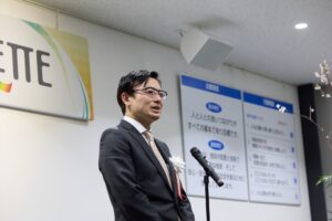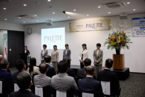 式典では、福井県 副知事 鷲頭様による来賓祝辞のほか、弊社女性社員で結成されたリニューアルプロジェクトチーム「Ribbon∞(リボーン)」メンバーによるPALETTEのコンセプト紹介、越のルビーアーティスト 山本様、山内様による特別ステージ、そしてテープカットを実施し、これまでのご支援への感謝をお伝えするとともに、PALETTEの完成を祝いました。