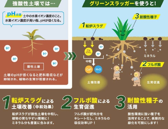 グリーンスラッガーは、①転炉スラグにより土壌改善(中和効果)、②フルボ酸による生育促進、③耐酸性種子の活用 の3つの特長により、強酸性土壌を長期的に緑化します。